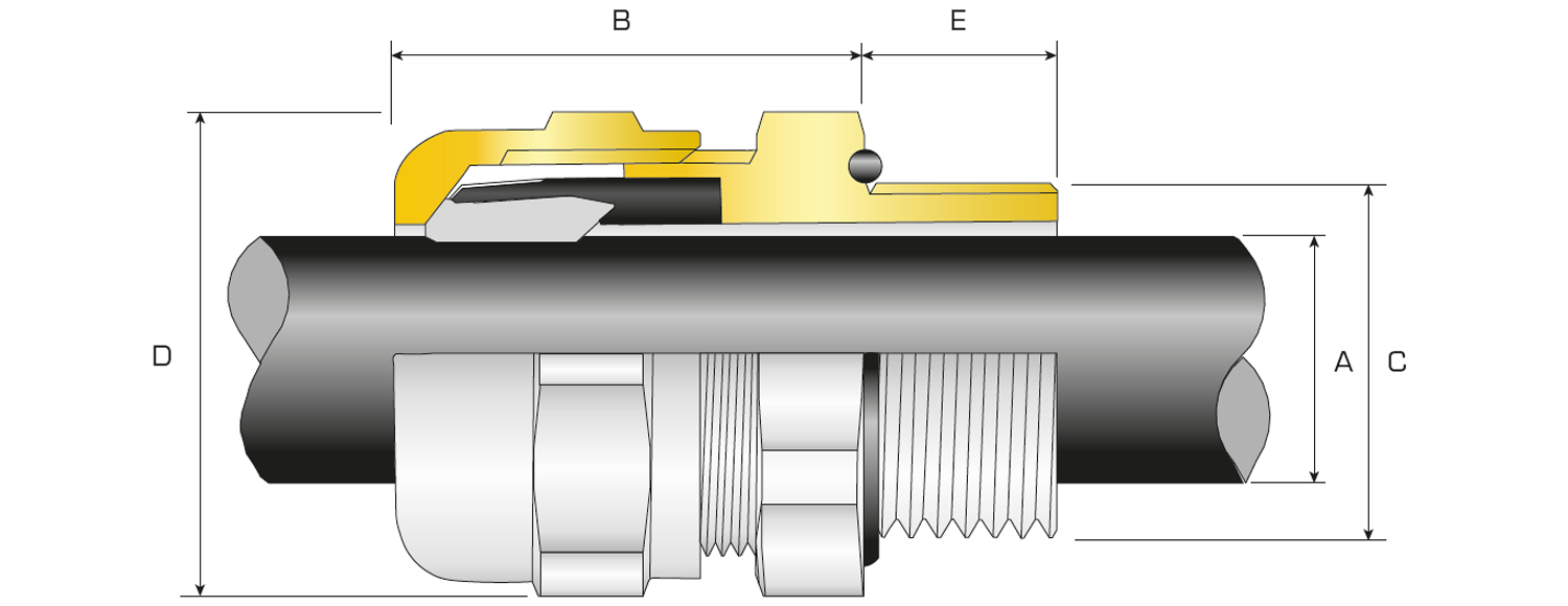 | Dual Seal | Available Entry Threads 'C' | Overall Cable Diameter 'A' | Across Flats 'D' | Across Corners 'D' | Protrusion Length 'B' | ||||||