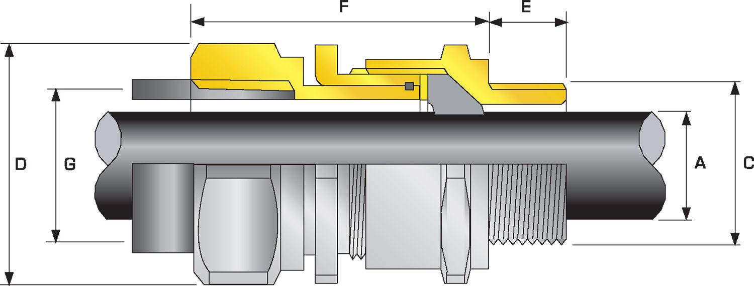 | Cable Gland Size | Available Entry Threads 'C' (Alternate Metric Thread Lengths Available) | Overall Cable Diameter 'A' | Across Flats 'D' | Across Corners 'D' | Female Conduit Connection 'G' | Protrusion Length 'F' | Combined Ordering Reference (*Brass Metric male & female) | Cable Gland Weight (Ozs) |