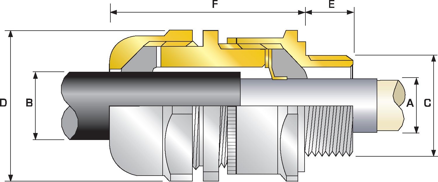 | Cable Gland Size | Available Entry Threads 'C' (Alternate Metric Thread Lengths Available) | Lead Sheath Diameter 'A' | Overall Cable Diameter 'B' | Across Flats 'D' | Across Corners 'D' | Protrusion Length 'F' | Combined Ordering Reference (*Brass Metric) | Shroud | Cable Gland Weight (Ozs) |