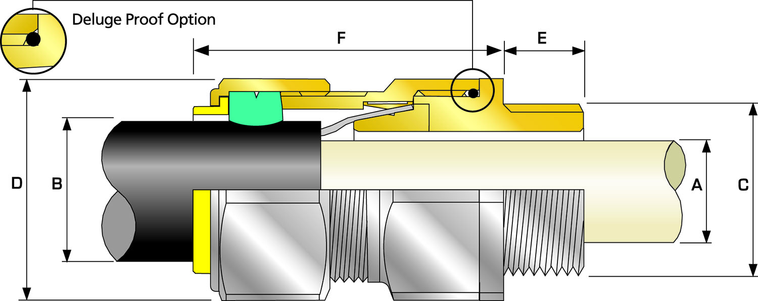 | Cable Gland Size | Entry Thread 'C' | Thread Length (Metric) 'E' | Cable Bedding Diameter 'A' | Overall Cable Diameter 'B' | Armour Range | Across Flats 'D' | Across Corners 'D' | Protrusion Length 'F' (Without Shroud) | Combined Ordering Reference (*Brass Metric) | Cable Gland Only Weight (Ozs) |