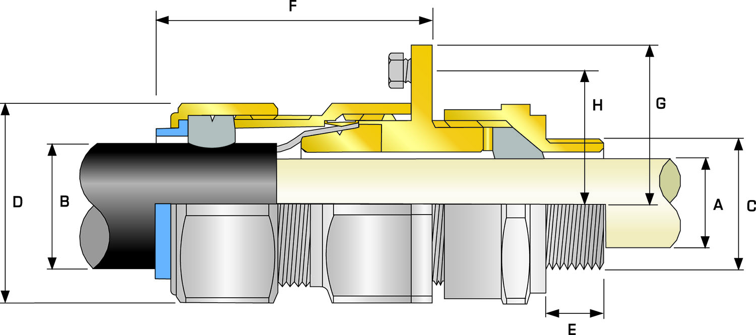 | Cable Gland Size | Available Entry Threads "C" (Alternate Metric Thread Lengths Available) | Cable Bedding Diameter "A" | Overall Cable Diameter "B" | Armour Range | Across Flats "D" | Across Corners "D" | Protrusion Length "F" | Nominal Radius Dimension | CIEL Earth Bolt Size | Earth Fault Current Rating (kA) | Combined Ordering Reference (*Brass Metric) | Cable Gland Weight (Kgs) | ||||||||||