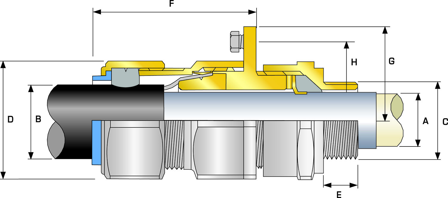 | Cable Gland Size | Available Entry Threads "C" (Alternate Metric Thread Lengths Available) | Lead Sheath Diameter "A" | Overall Cable Diameter "B" | Armour Range | Across Flats "D" | Across Corners "D" | Protrusion Length "F" | Nominal Radius Dimension | CIEL Earth Bolt Size | Earth Fault Current Rating (kA) | Combined Ordering Reference (*Brass Metric) | Cable Gland Weight (Kgs) | ||||||||||
