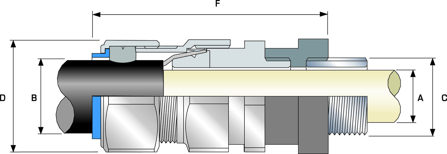 | Cable Gland Size | Clearance Hole Diameter "C" | Cable Bedding Diameter "A" | Overall Cable Diameter "B" | Armour Range | Across Flats "D" | Across Corners "D" | Protrusion Length "F" | Ordering Reference (Brass Metric) | Shroud (B323) | Cable Gland Weight (Ozs) | ||