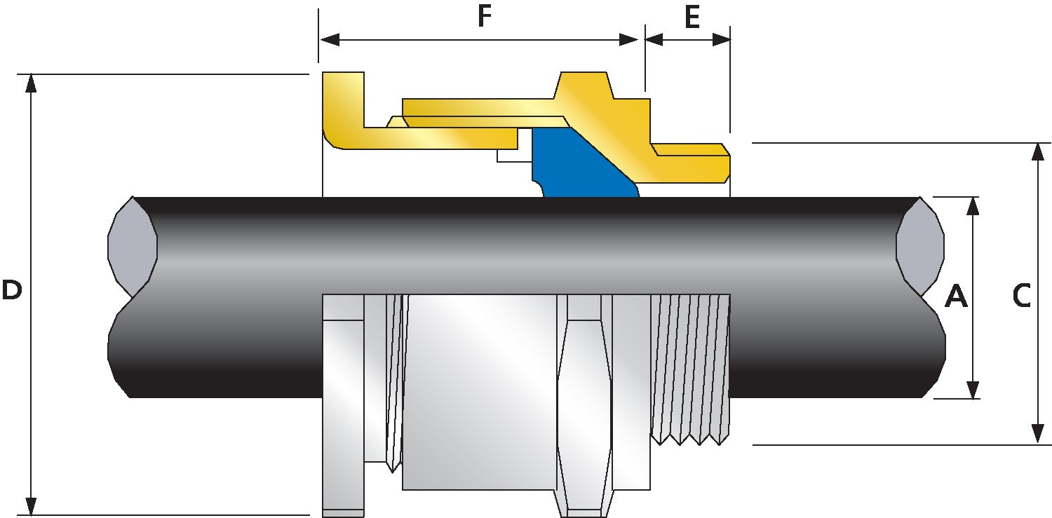 | Cable Gland Size | Available Entry Threads 'C' (Alternate Metric Thread Lengths Available) | Overall Cable Diameter 'A' | Across Flats 'D' | Across Corners 'D' | Protrusion Length 'F' | Combined Ordering Reference (*Brass Metric) | Shroud | Cable Gland Weight (Ozs) |