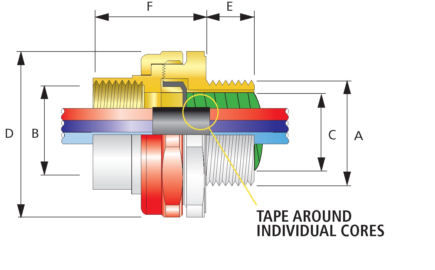 | Ordering Reference (Brass, Metric) | Male Forward Thread Size 'A' | Minimum Thread Length 'E' | Female Rear Thread Size 'B' | Ordering Reference (Brass, NPT) | Male Forward NPT Thread Size 'A' | Minimum NPT Thread Length 'E' (in) | Female Rear Thread Size 'B' | Diameter Over Cores 'C' | Max. Number of Cores | Protrusion Length 'F' | Across Flats Hex 'D' | Across Corners Ø 'D' | Installation Torque (Nm) |