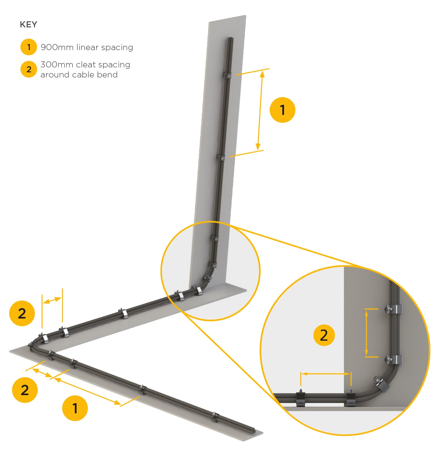 If the required cable cleat spacing of any particular installation exceeds a distance of 1800mm, it should be noted that every installation is different, CMP Products will work with customers to ensure a safe and successful installation on a case-by-case basis.